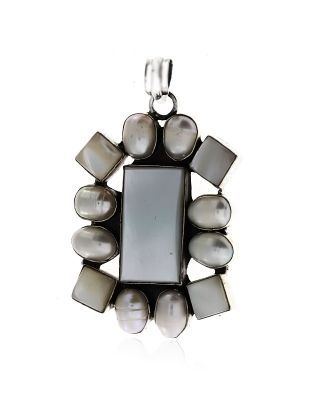 Hipnotyzujący wisiorek z wieloma kamieniami wykonany w całości z oksydowanego srebra najwyższej próby 0,925 z macicą perłowa  w kolorze opalizująco białym w...
