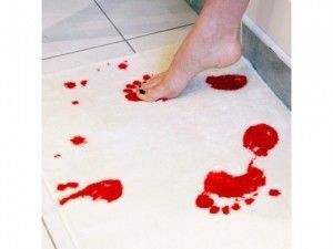 Biała mata do łazienki z krwawym motywem, czyli niebanalny chodnik o mrocznym charakterze. Idealny na co dzień oraz jako niebanalna dekoracja na imprezę Halloween. Doskonale komponuje się w mieszkaniach fanów horrorów i filmów grozy.