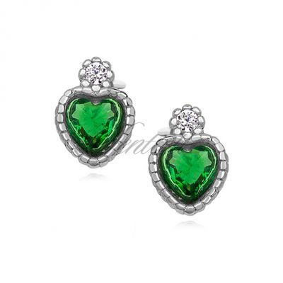 Srebrne pr.925 kolczyki serduszka z szmaragdową cyrkonią - Szmaragdowa