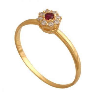 Pierścionek z kamieniem w kolorze rubinu otoczony wianuszkiem cyrkonii.